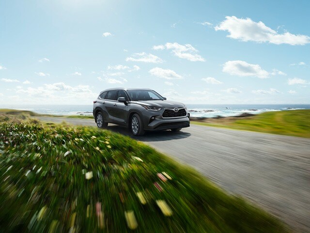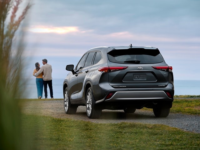 Grey Toyota Highlander Hybrid Limited parked in front of the ocean